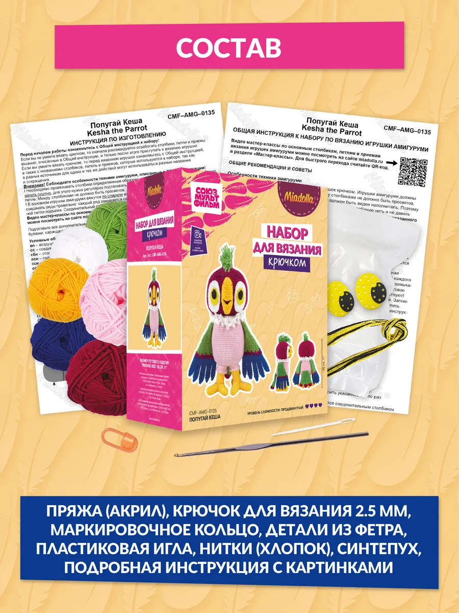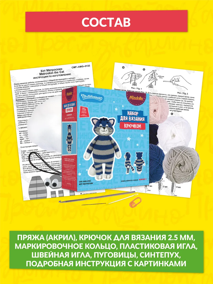 - Готовый набор — внутри пряжа, инструменты, инструкция.