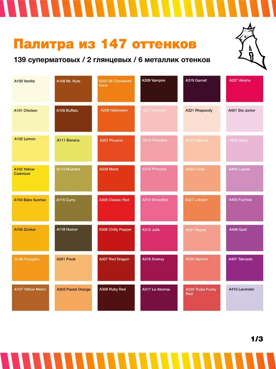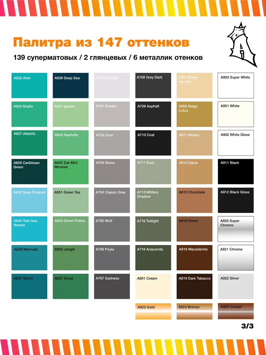 Объем баллона составляет 520 мл, рабочий объем — 400 мл. Вес нетто — 300 гр, что на 7% больше, чем у аналогичной продукции конкурентов. Палитра включает 139 цветов, а также золото, медь, бронзу и супер хром.
